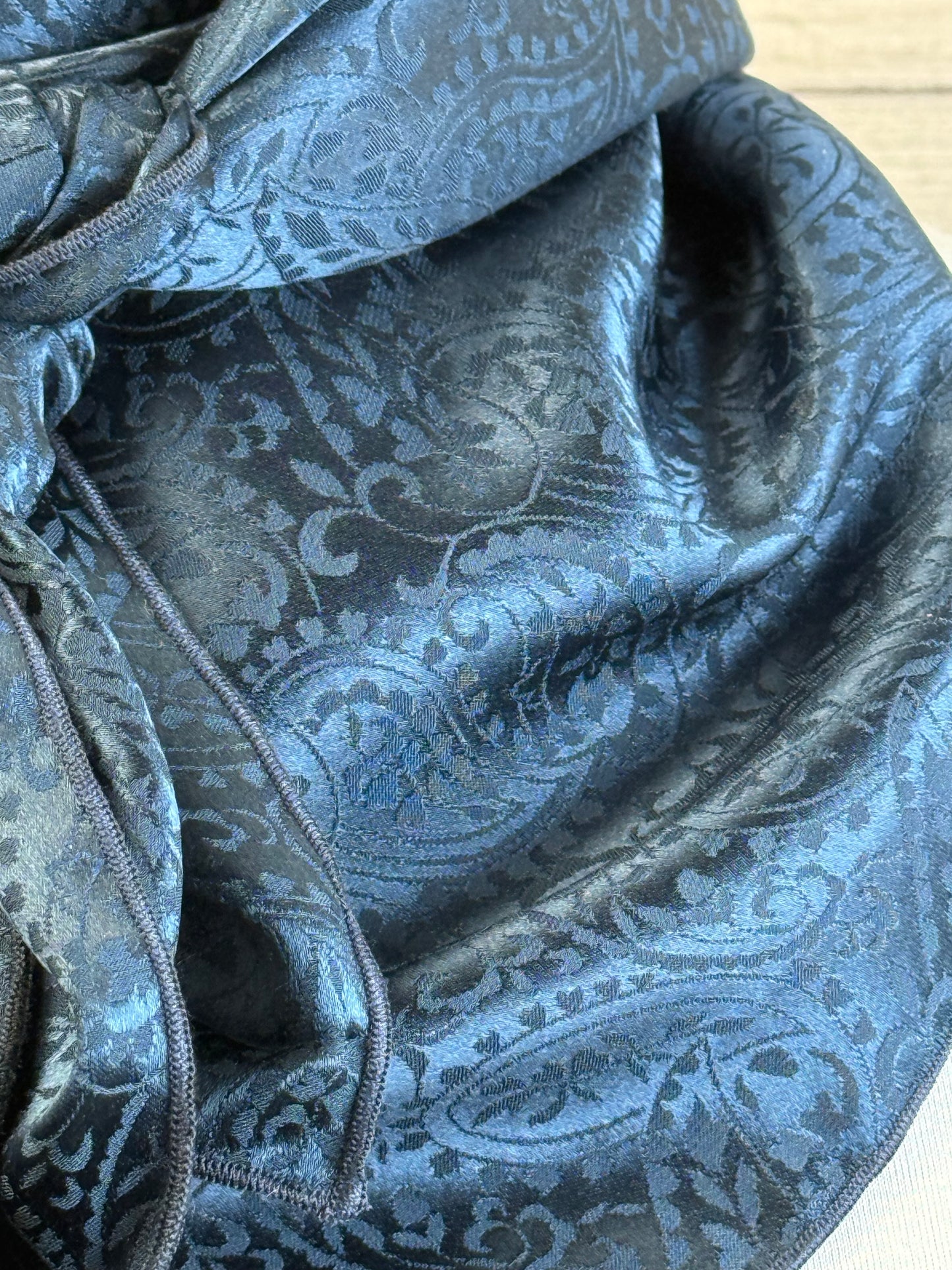 This silk is incredibly soft to the touch and lightweight. This is a charmeuse textured jacquard with a paisley background. This is a beautiful fabric.